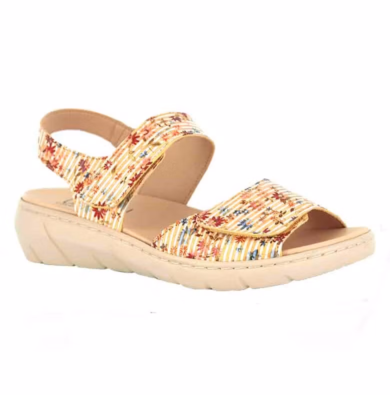 Stina är en lätt och nätt småblommig skinnsandal med kardborrar. Känner du sommarkänslan?