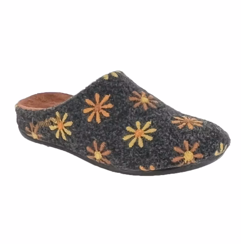 En mjuk och mysig toffel prydd med vackra blommor och ett matchande plyschfoder.